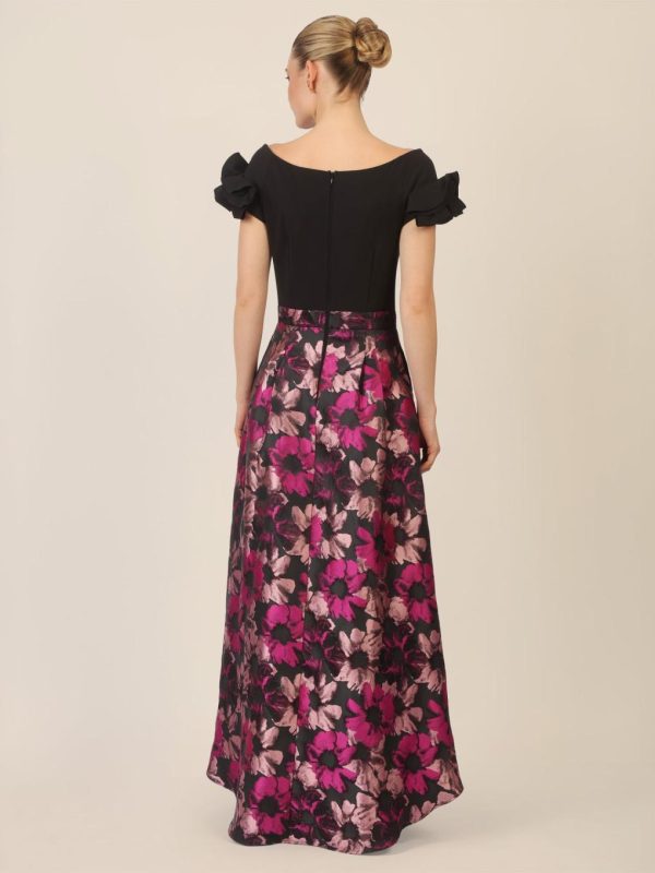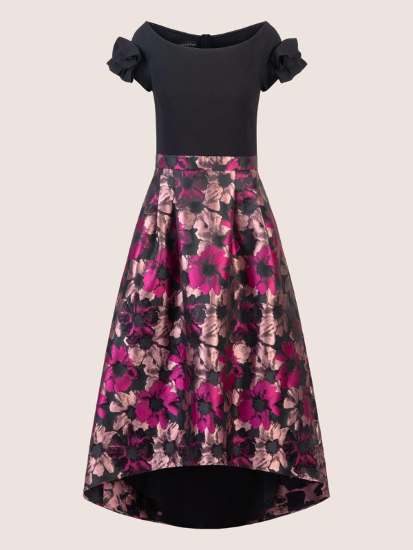 Dieses figurbetonte Maxikleid besticht durch seinen edlen Materialmix aus festem Jersey und floral gemustertem Jacquard. Der sehr weite Ausschnitt sorgt für einen modernen Look und wird durch ein innenliegendes Silicontape optimal fixiert. Zarte Rosetten schmücken die kurzen Ärmel und verleihen dem Kleid eine romantische Note. Formgebende Nähte sowie ein breiter Jacquard-Tailleneinsatz unterstreichen die weibliche Silhouette. Der ausgestellte Rockpart mit vorne und hinten gelegten Falten wirkt schwungvoll und feminin. Highlight ist die asymmetrische Länge – vorne etwas kürzer als hinten – für einen eleganten Auftritt mit Blickfanggarantie. Länge: vorne ca. 120?cm, hinten ca. 150?cm.