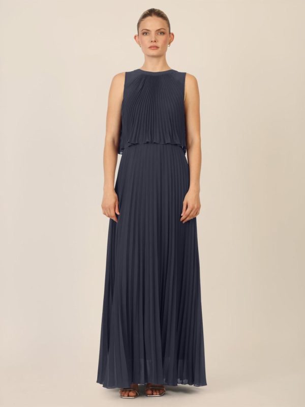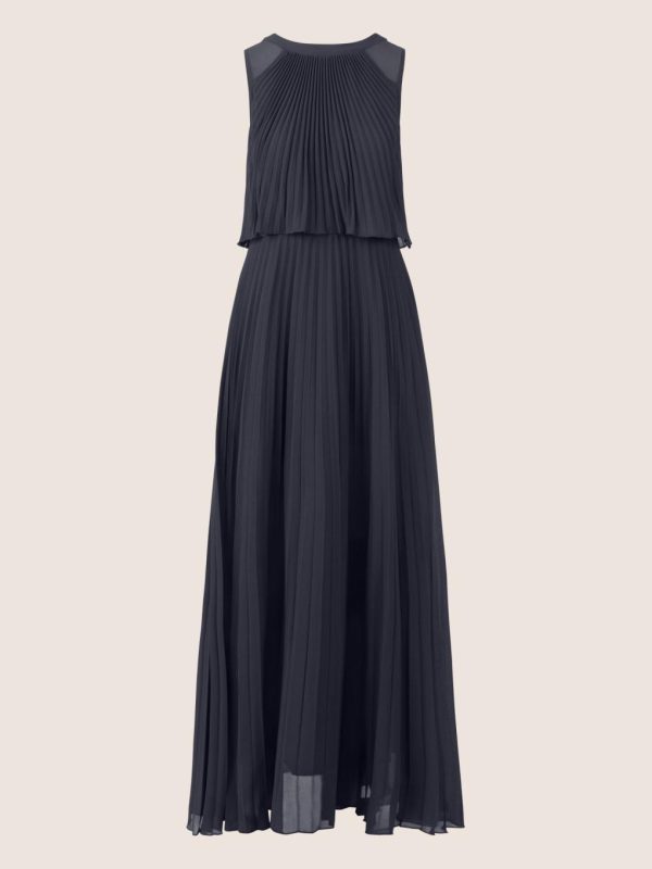 Dieses traumhafte Maxikleid ist ein echtes Statement in Sachen Leichtigkeit und Stil. Das Oberteil besticht mit lose fallendem Sonnenplissee bis zur Taille und einem schmalen, sichtbaren Halsring, der dem runden Ausschnitt vorne und hinten eine raffinierte Struktur verleiht. Darunter sorgt ein schmal geschnittenes Futter mit formgebenden Abnähern für eine perfekte Passform. Die schmale Taillennaht betont die Silhouette, bevor der Rockpart in weitschwingendem Sonnenplissee für Bewegung und Glamour sorgt. Der Reißverschluss in der hinteren Mitte vollendet das Design. Länge: ca. 150 cm – ideal für elegante Auftritte mit Wow-Effekt.