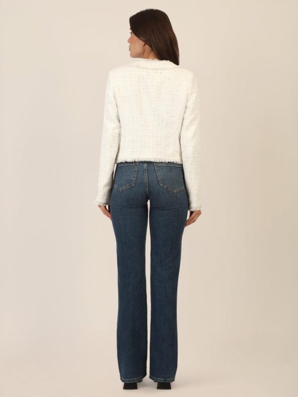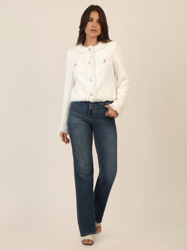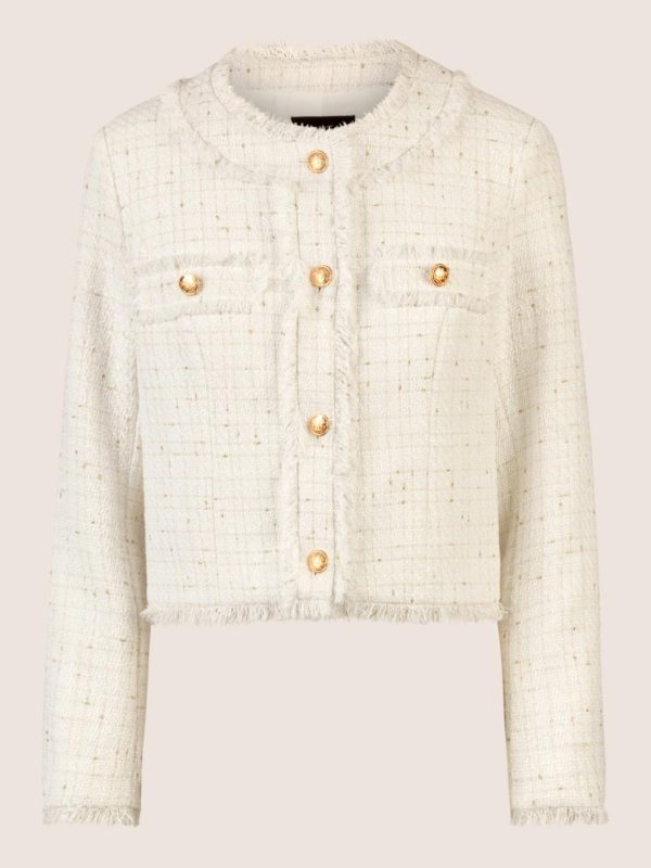 Dieser kurze Bouclé-Blazer begeistert mit eingewebten, goldfarbenen Fasern, die dem klassischen Schnitt einen Hauch von Glamour verleihen. Die offenen Fransenkanten an Ausschnitt, Vorderkante, Ärmelsaum und Saumabschluss sorgen für einen modischen Twist und unterstreichen die handwerkliche Raffinesse. Die taillierte Silhouette wird durch präzise gesetzte Teilungsnähte vorn und hinten konturiert, während eine gerade Knopfleiste mit goldfarbenen Metallknöpfen den Look luxuriös abrundet. Dekorative Zierleisten mit passenden Knöpfen setzen zusätzliche Akzente. Mit seinem runden Halsausschnitt, den langen Ärmeln und der komplett gefütterten Verarbeitung ist dieser Blazer nicht nur edel, sondern auch angenehm zu tragen. Mit einer Länge von ca. 44 cm perfekt für festliche Ensembles oder elegante Alltags-Styles.