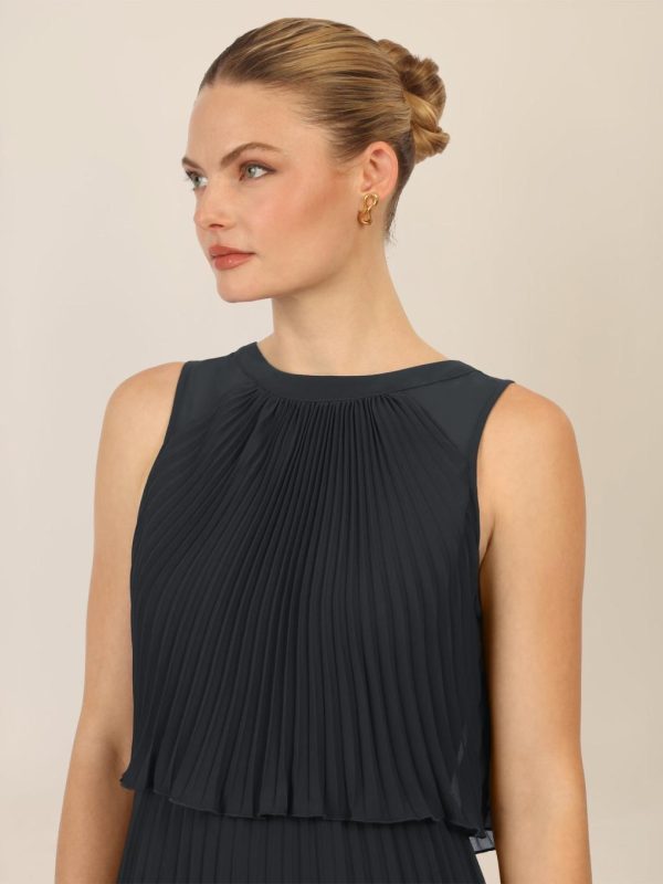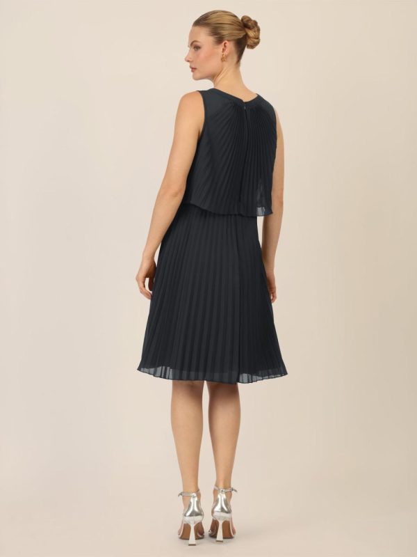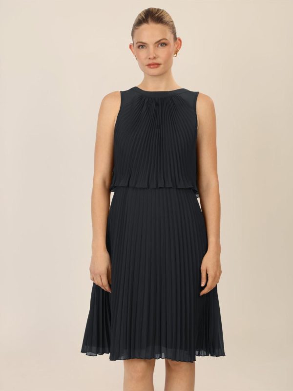 Dieses Plisseekleid verkörpert feminine Leichtigkeit und edle Raffinesse. Der runde Ausschnitt vorn und hinten wird durch einen schmalen, sichtbaren Halsring betont und verleiht dem Kleid einen besonderen Twist. Das Oberteil aus locker fallendem Sonnenplissee endet auf Taillenhöhe, während das schmal geschnittene Futter darunter mit formgebenden Abnähern für eine perfekte Silhouette sorgt. Die Taillennaht hebt den weitschwingenden Rockpart aus Sonnenplissee stilvoll hervor. Mit Reißverschluss in der hinteren Mitte. Länge: ca. 98 cm.