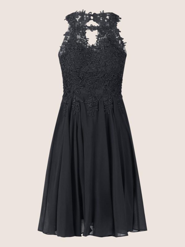 Ein eleganter Mix aus plastischer Spitze und fließendem Chiffon macht dieses kurze Cocktailkleid zum stilvollen Hingucker. Der raffinierte, angedeutete amerikanische Ausschnitt mit zarter Halsblende und Knopfdetails sorgt für einen femininen Touch. Während ein kleiner Schlitz vorn dezent Einblicke gewährt, überrascht der Rücken mit einem tiefen Ausschnitt – perfekt für unvergessliche Abende! Eingearbeitete Brustpads und eine zarte Blütenranken-Taillenbetonung sorgen für eine traumhafte Silhouette. Der weit schwingende Rock unterstreicht den romantischen Charakter. Komplett gefüttert und mit Reißverschluss im Rückteil – ready to wow!
