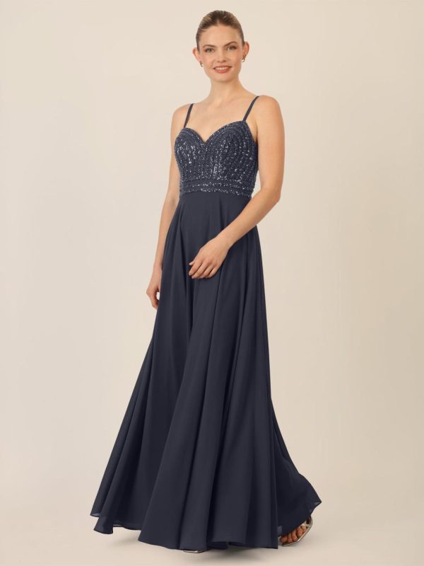 Dieses atemberaubende Abendkleid ist gemacht für unvergessliche Momente! Das Oberteil verführt im angesagten Bikini-Stil und ist allover mit funkelnden Pailletten und edlen Perlen bestickt – ein echtes Highlight! Der tiefe V-Ausschnitt am Rücken sorgt für einen Wow-Effekt, während die verstellbaren Spaghettiträger und eingearbeiteten Brustpads optimalen Halt bieten. Der weich fließende Chiffonrock schwingt traumhaft bei jedem Schritt und ist komplett mit Satin gefüttert – purer Luxus! Mit Reißverschluss in der hinteren Mitte und ca. 150 cm Länge ist dieses Kleid die perfekte Wahl für Gala, Ball oder Hochzeit.