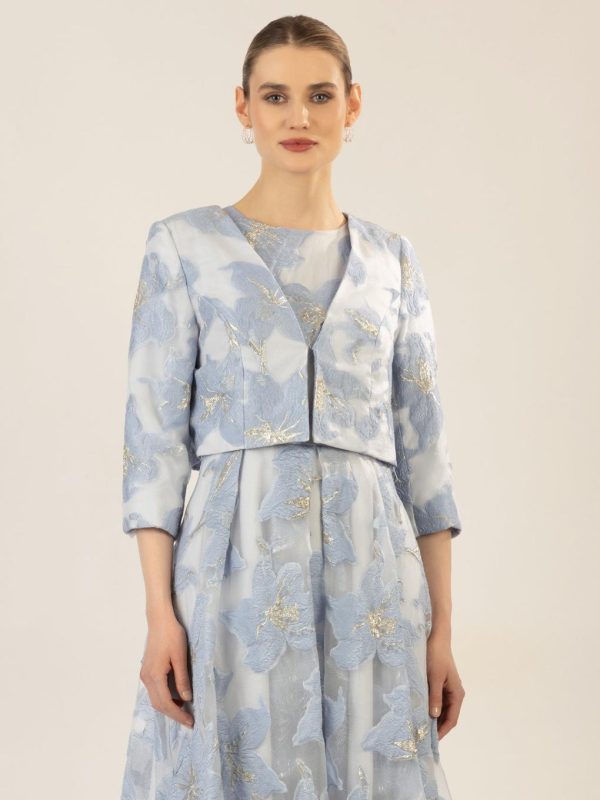 Eleganter Bolero aus Jacquard mit strukturiertem Muster und stilvollen Details. Tiefer V-Ausschnitt. Lange Ärmel. Kurze Bolero-Länge. Offene Front ohne Verschluss. Perfekt als Ergänzung zu Kleidern für besondere Anlässe.