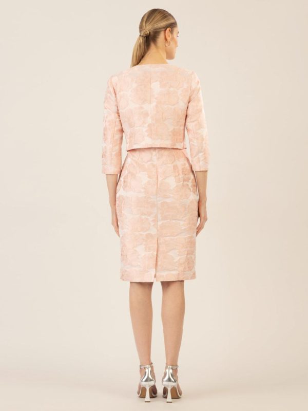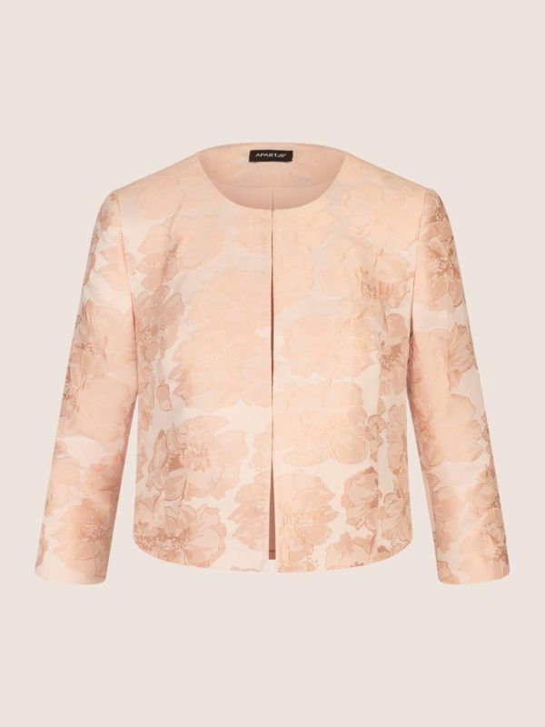 Elegantes Jacquard-Bolero mit feinem Blumenmuster. Die offene Vorderseite sorgt für einen modernen Look, während die leicht verkürzte Länge den Fokus auf die Taille legt. Ideal für besondere Anlässe oder als stilvolle Ergänzung zu Kleidern.