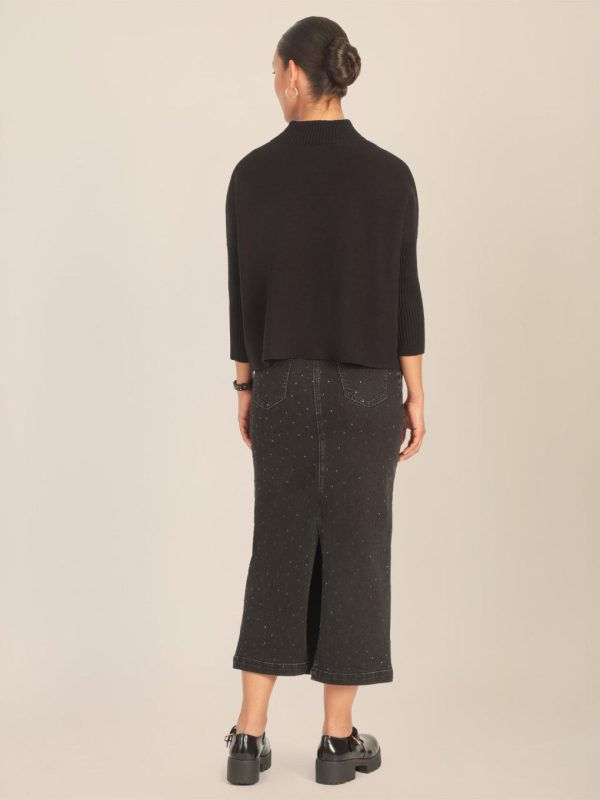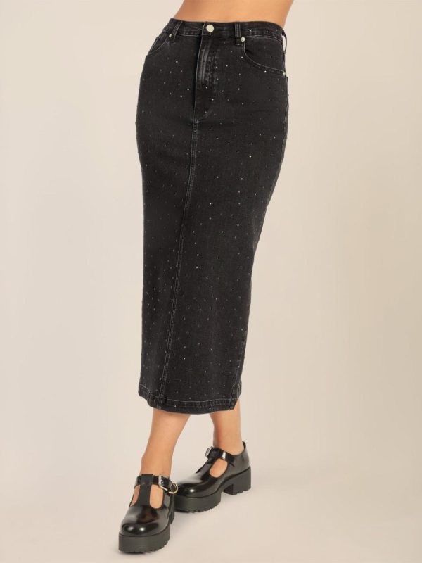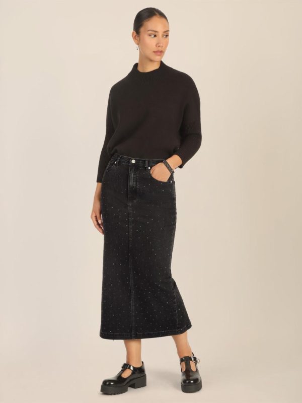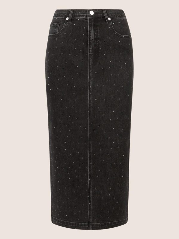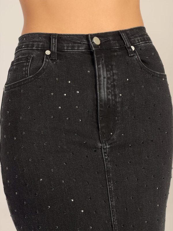 Ein Denim-Piece mit Glam-Faktor: Dieser 5-Pocket Jeansrock in angesagter Stone-Washed-Optik wird durch schwarze Kristallsteine allover zum absoluten Highlight. Der Formbund mit Gürtelschlaufen und der mattsilberfarbene Nietenknopf am Bund unterstreichen den klassischen Jeanslook. Mit Zipper-Fly und aufgesetzten Gesäßtaschen zeigt sich der Rock zugleich lässig und edel. Länge: ca. 84 cm.