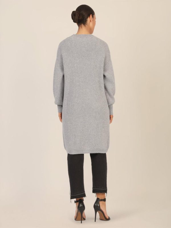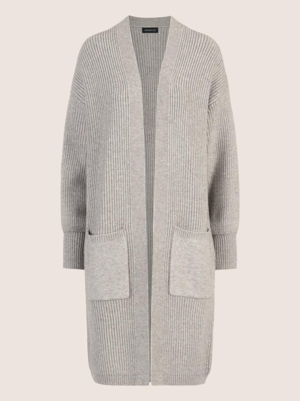 Diese lange, verschlusslose Strickjacke ist der perfekte Begleiter für entspannte und stilvolle Looks. Gefertigt aus einer weichen Viskose-Kaschmir-Mischung überzeugt sie durch ihren angenehm soften Griff. Das elegante Halbpatentmuster verleiht Struktur, während die krausgestrickte Blende an Ausschnitt und Vorderkante für dezente Akzente sorgt. Die weiten Ärmel mit schmalem Rippenbündchen und die glatt gestrickten, aufgesetzten Taschen runden das Design funktional und modern ab. Ideal für Layering an kühleren Tagen. Länge: ca. 92 cm.