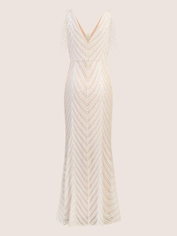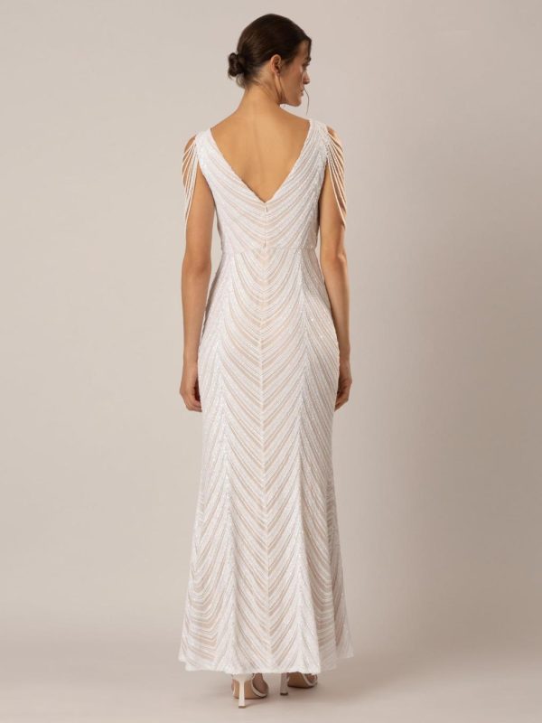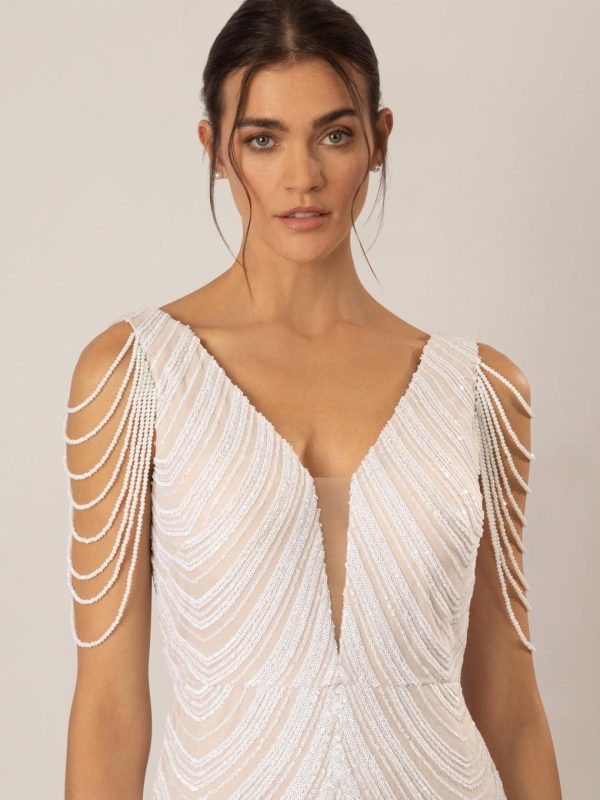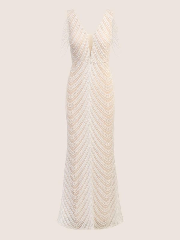Das APART Hochzeitskleid ist ein elegantes und edles Kleidungsstück, das perfekt für den besonderen Tag geeignet ist. Der breite Ausschnitt mit tiefen V-Ausschnitten verleiht dem Kleid eine feminine Note, während der nudefarbene Mesh-Einsatz vorne für einen Hauch von Eleganz sorgt. Die Armlöcher sind mit mehrlagigen Ketten verziert, was dem Kleid einen modernen und glamourösen Look verleiht. Eingearbeitete Bustpads sorgen für eine perfekte Passform und die Tailennaht betont die Figur auf vorteilhafte Weise. Insgesamt strahlt das APART Hochzeitskleid eine formale und ermutigende Tonart aus, die jede Braut strahlen lässt: