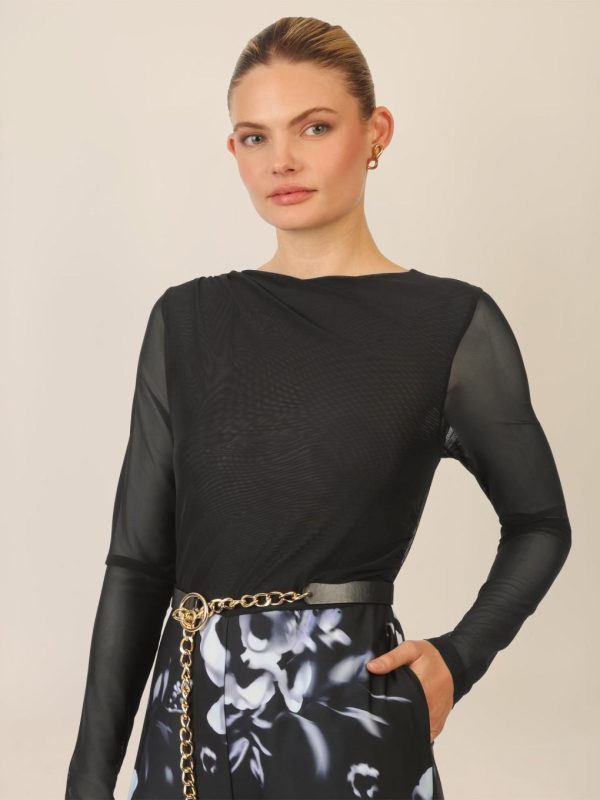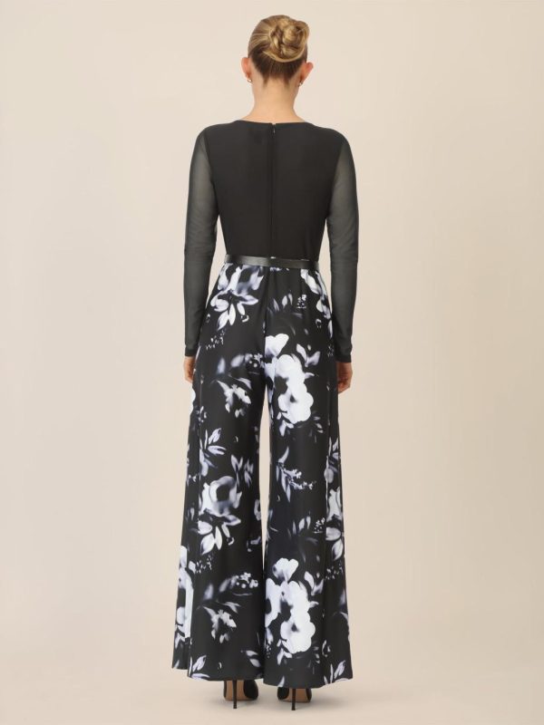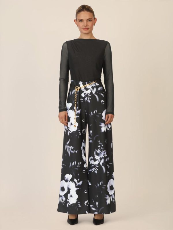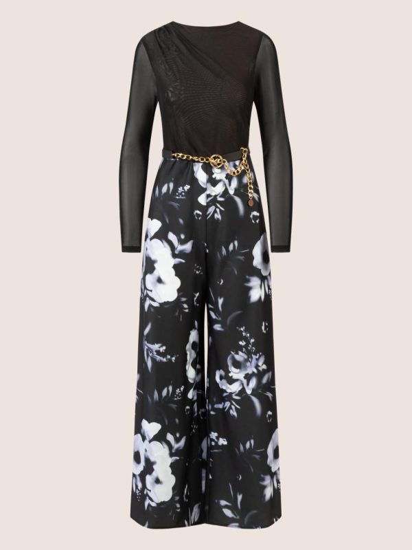 Ein Must-have für besondere Anlässe: Dieser Overall kombiniert weich fließenden Mesh mit mattschimmerndem Satin in floralem Allover-Print – für einen ausdrucksstarken und zugleich femininen Look. Der gerade, leicht u-bootförmige Ausschnitt vorn und hinten unterstreicht das elegante Design. Das doppellagig gearbeitete Oberteil zeigt raffinierte Raffungen an der linken Schulter und der rechten Seitennaht – subtile Details mit großer Wirkung. Die schmal geschnittenen, langen Ärmel sorgen für eine ausgewogene Silhouette. Der weite Beinverlauf der Hosenpartie wirkt fließend und modern, während der vertiefte Schritt und seitliche Eingriffstaschen den Komfort erhöhen. Ein stilvoller PU-Gürtel mit goldfarbener Kette und Schnalle akzentuiert die Taille und rundet das Design ab. Mit Reißverschluss in der hinteren Mitte und einer Seitenlänge von ca. 108 cm ist dieser Overall ein stilvoller Blickfang für elegante Events.