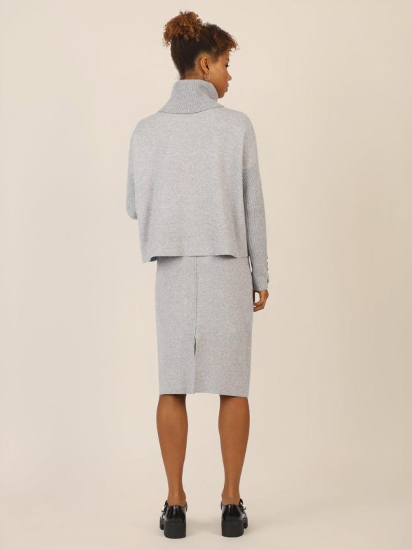 Dieses raffinierte Oberteil vereint Cape und Pullover in einem luxuriösen Design aus softem Milano-Knit – eine hochwertige Viskosemischung mit edlem Kaschmir. Die langen Rippenärmel überraschen mit einem Schlitz am Saum, der mit drei goldfarbenen Schmuckknöpfen glamourös in Szene gesetzt wird. Der hohe, weit geschnittene Rippenrollkragen sorgt für ein cozy Finish mit Stil. Ein trendiges Keypiece mit cleanem Chic und spannenden Details. Länge: ca. 56 cm.
