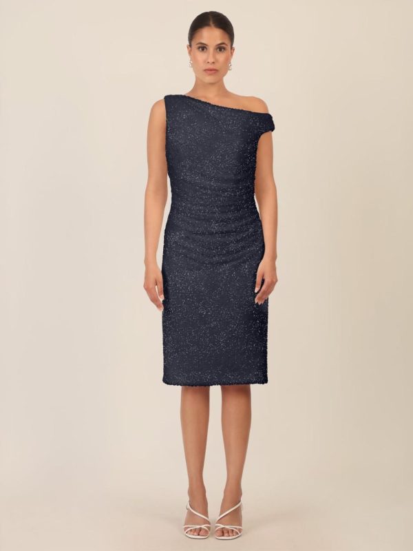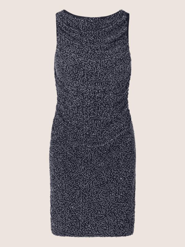 Dieses ärmellose Cocktailkleid ist ein echter Eyecatcher! Die elastische, figurumschmeichelnde Ware ist komplett mit schimmernden Perlen bestickt – pure Eleganz in Bewegung. Der breite Rundhalsausschnitt vorne und hinten präsentiert sich in moderner Wasserfalloptik, die sanft fällt und verführerisch wirkt. Raffungen entlang der Seiten sorgen für eine schmeichelhafte Silhouette, die bis zur Hüfte elegant modelliert. Ein Reißverschluss im Rücken erleichtert das Anziehen. Komplett gefüttert für maximalen Tragekomfort. Länge: ca. 98cm.
