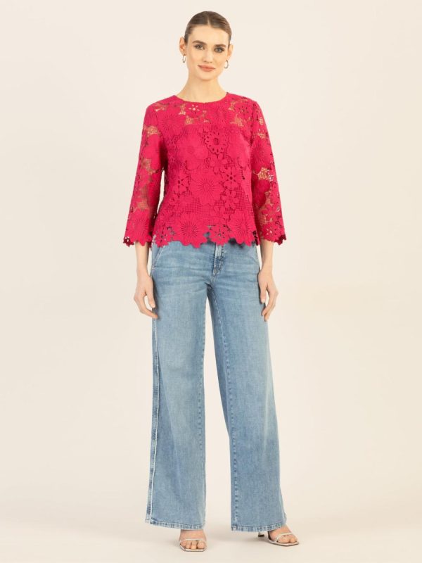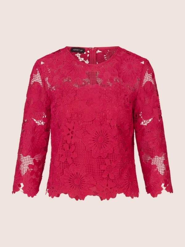 Diese edle Spitzenbluse kombiniert eine feminine Note mit modernen Details. Der runde Halsausschnitt und die halblangen Ärmel sorgen für einen klassischen Look, während das florale Spitzenmuster die Bluse verspielt und stilvoll wirken lässt. Die transparente Optik an den Ärmeln und der Saum mit floralen Abschlüssen setzen besondere Akzente. Diese Bluse eignet sich perfekt für festliche Anlässe oder elegante Casual-Outfits.